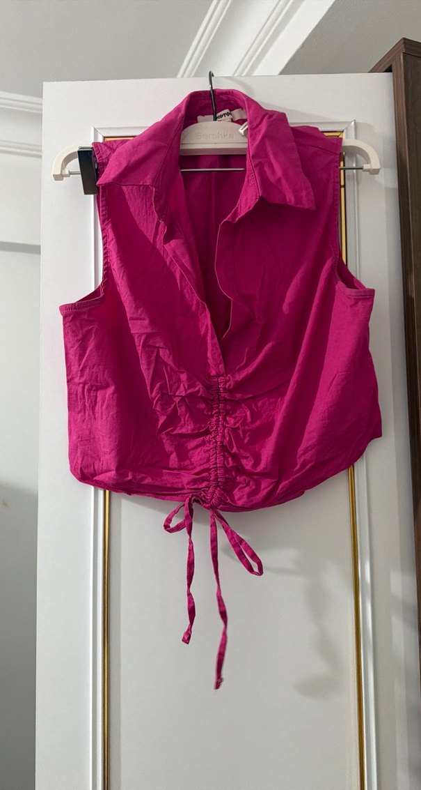 Pembe keten kolsuz gömlek, yakalı ve düğmeli. Belden büzgülü, kısa ve vücuda oturan kesimiyle cesur Paris bohem tarzını yansıtıyor.
