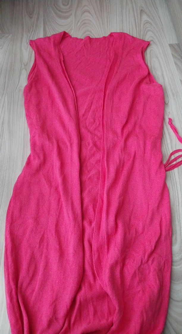 Yumuşak polar kumaştan yapılmış, pembe renkli, kolsuz, drapeli ve straplez yakalı yelek