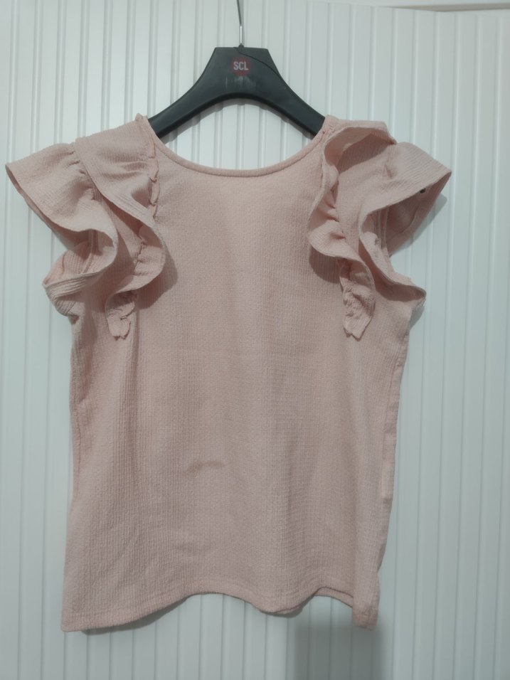 Bu pembe bluz, kolsuz ve fırfırlı kollara sahip, bol kesim ve yuvarlak yakalıdır. Kısa boyu minimalist sokak tarzına uygundur.