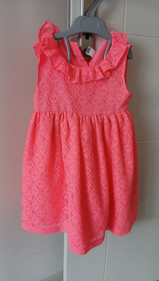 Kolsuz, fırfırlı yakası olan pembe kız çocuk elbisesi. Sentetik kumaştan, bol kesim ve canlı renkte.