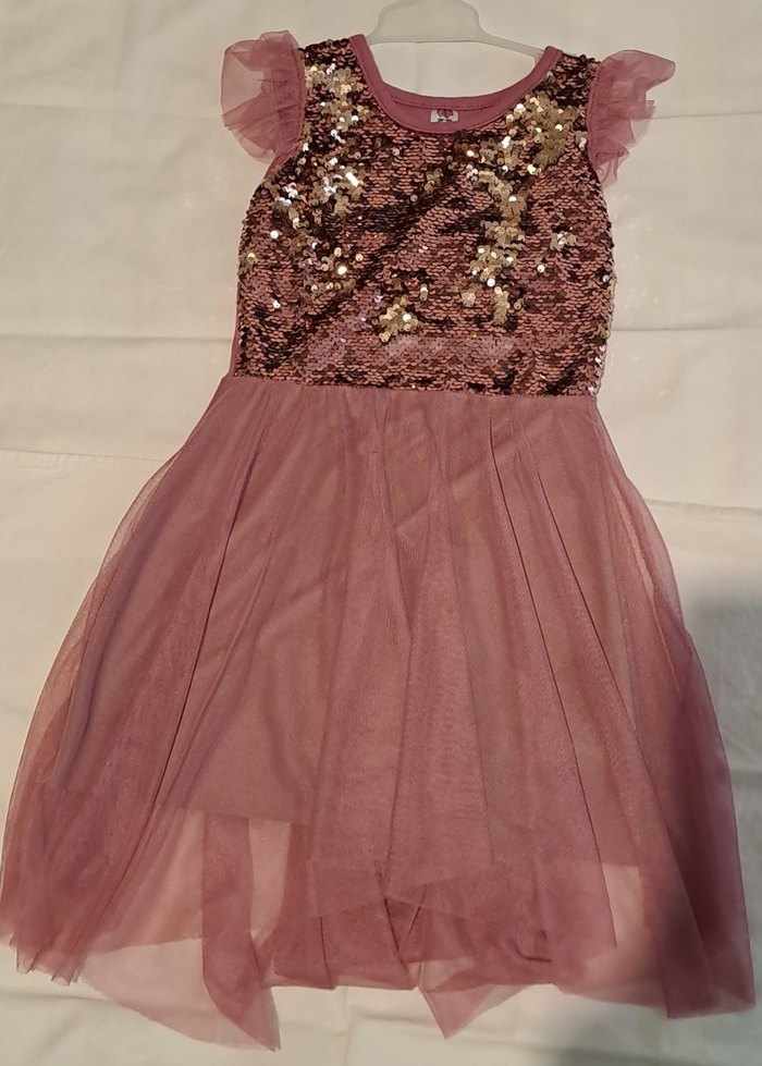 Parlak sentetik kumaştan, kolsuz ve fırfırlı detaylı, straplez yakalı, bohem tarzda pembe kız elbisesi.