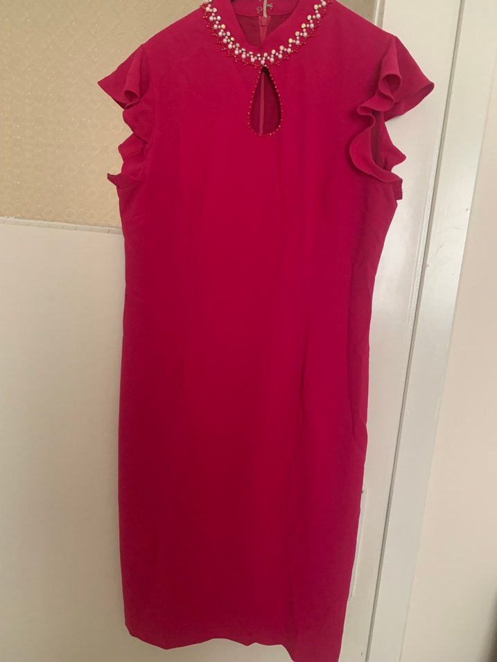 V yaka ve fırfırlı kolsuz detaylara sahip, işlemeli ve parlak pembe renkte uzun, vücuda oturan abiye elbise.