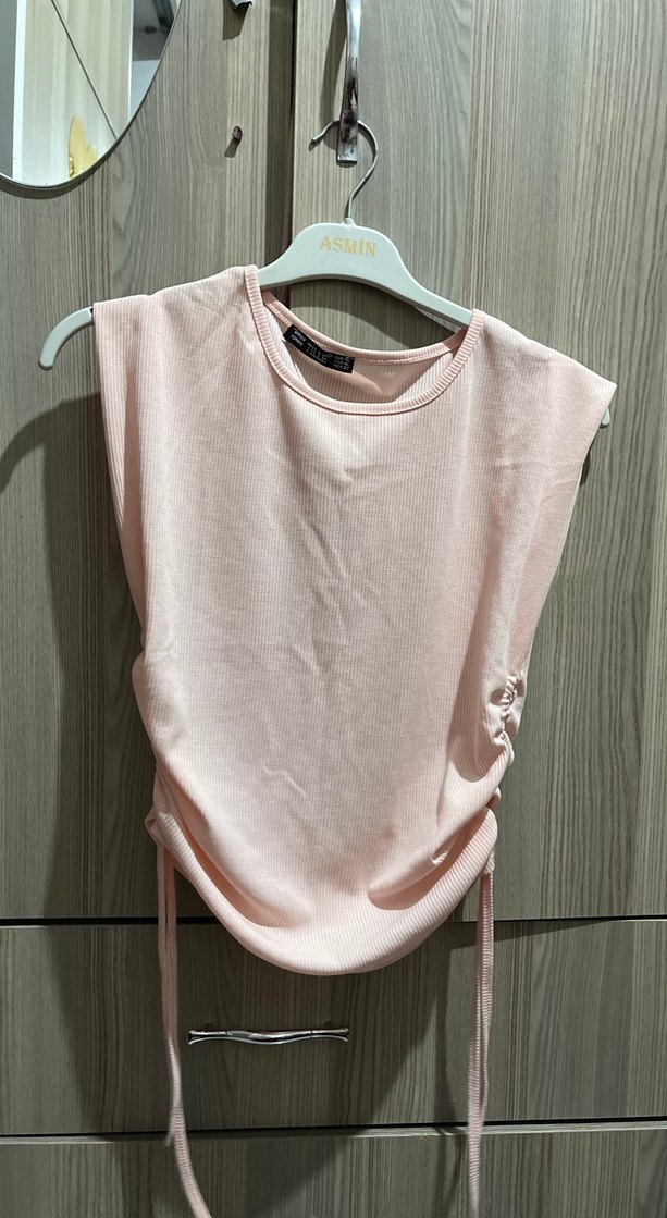 Pembe renkte, kolsuz, keten kumaştan, bol kesim ve drapeli, yuvarlak yakalı kısa mini bluz.