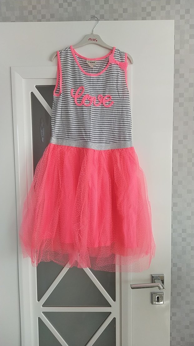Kolsuz, dar kesim kız çocuk elbisesi. Üst kısmı çizgili ve "love" baskılı, altı pembe renkli, yumuşak tüllü sentetik kumaştan fırfırlı etekli.