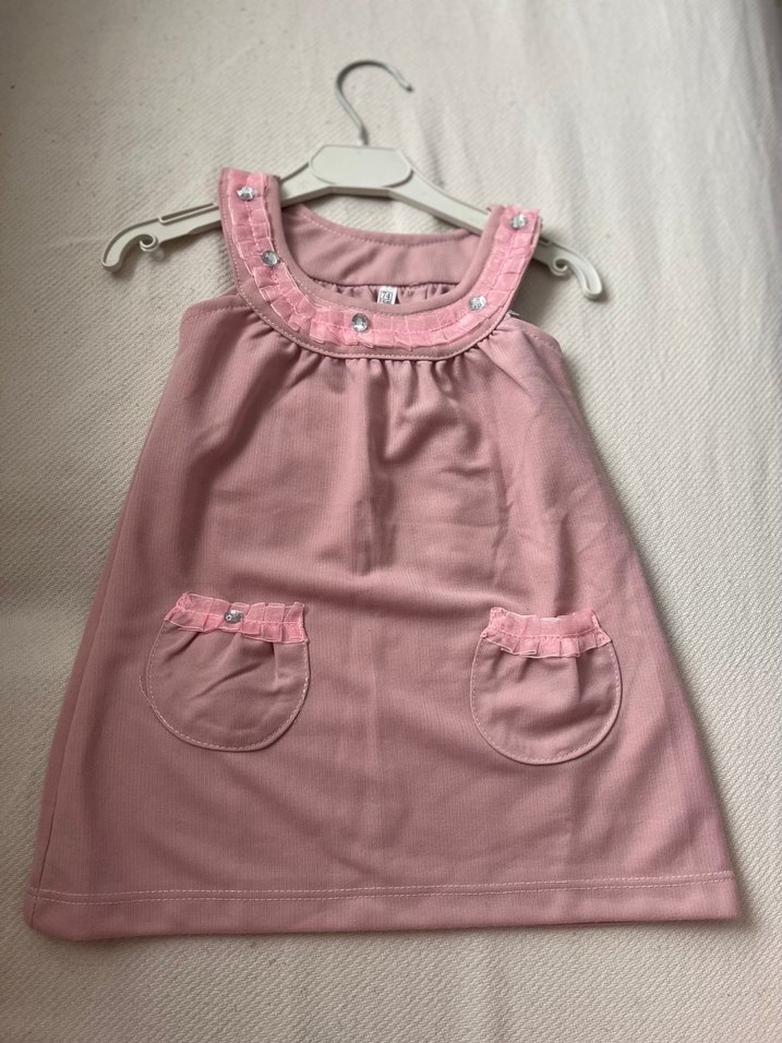 Pembe, kolsuz kız çocuk elbisesi, bol kesim, yuvarlak yakalı ve yakada ile ceplerde fırfır detaylıdır. Yumuşak sentetik kumaştan yapılmıştır. Hiç kullanılmadı sıfır ürün 12 ay için