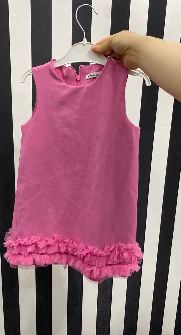 Kolsuz, yuvarlak yakalı ve bol kesim pembe kız elbisesi, yumuşak ve sıcak kumaştan fırfır detaylı etek ucunda biraz sökülme var fotografta belli ettim ve fiyata yansıttım