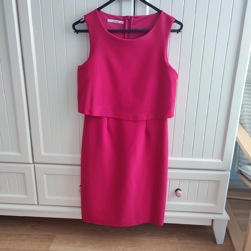 Kolsuz, pembe midi elbise, regular fit ve drapeli tasarıma sahip, parlak görünümlü ve sade, askısız yakalı. Ofis kullanımı için uygun. Ufak bir ip çekmesi var, fotoğrafta gösterdim. Çok yakından belli oluyor ancak .