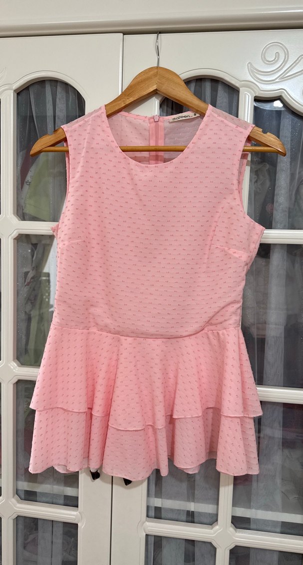Kolsuz, yuvarlak yakalı pembe bluz, belinde fırfır detayıyla. Rahat kesim ve midi boyda, yumuşak sentetik kumaştan, günlük kullanıma uygun. Sateen marka m beden fırfırlı kumaş normal kalıp çok cici
