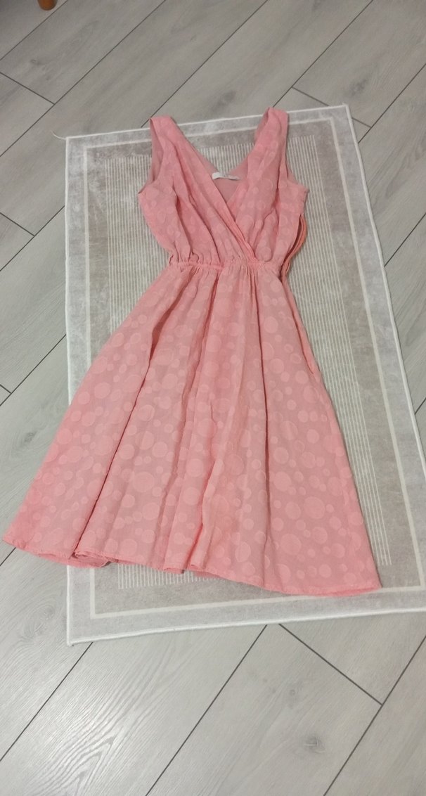 Pastel pembe kolsuz hamile elbisesi, V yakalı ve bol kesimdir. Yumuşak keten kumaştan, drapeli astarlı bohem vintage tarzda, günlük kullanım için uygundur.