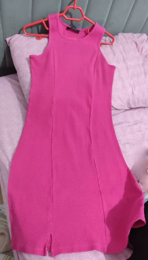 Pembe, kolsuz, midi uzunlukta, vücuda oturan ve günlük elbise. Yumuşak sentetik kumaştan, rahat sokak stili için uygun.