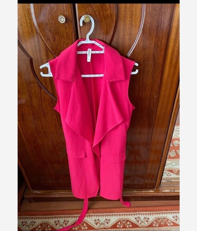 Yumuşak ve sıcak kumaştan yapılmış, pembe kolsuz yelek. Notlu yaka ve drapeli ön kısmı, normal midi boy ve rahat kesimlidir.