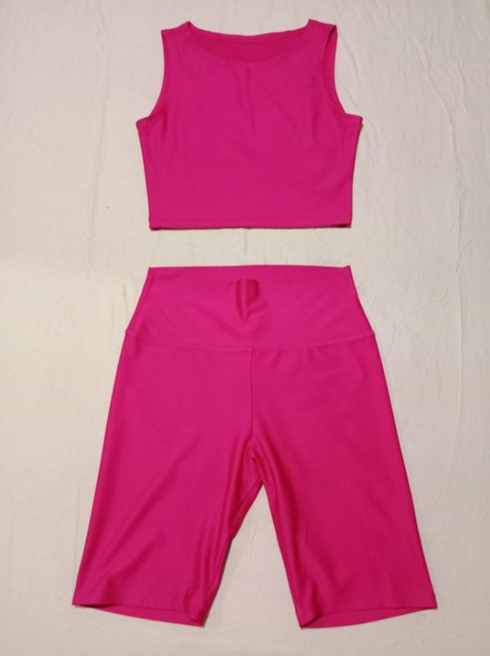 Pembe renkli, kolsuz mini atlet ve yüksek bel şorttan oluşan, rahat ve şık sentetik kumaş aktif giyim seti. marka temsilidir