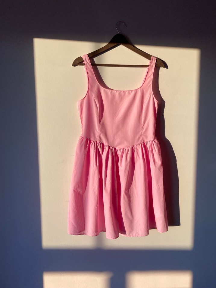 Yumuşak keten kumaştan yapılmış, salaş kesim, tek renk pembe mini elbise. Kayık yaka ve pileli etek detayıyla günlük kullanıma uygun.