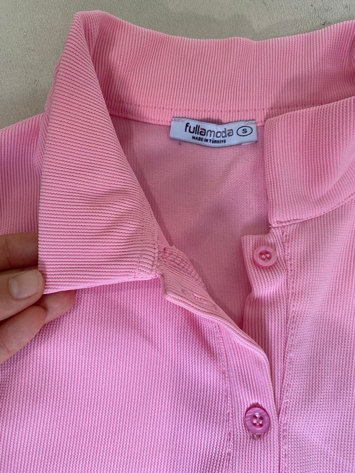 kolsuz, düğmeli ön kısmı ve polo yaka olan pembe tişört. Düz tasarımlı, sentetik kumaştan ve vücuda oturan kesimde. Birkaç kere giydim, artık kullanmadığım için satıyorum. 1 yıldır dolabımda
