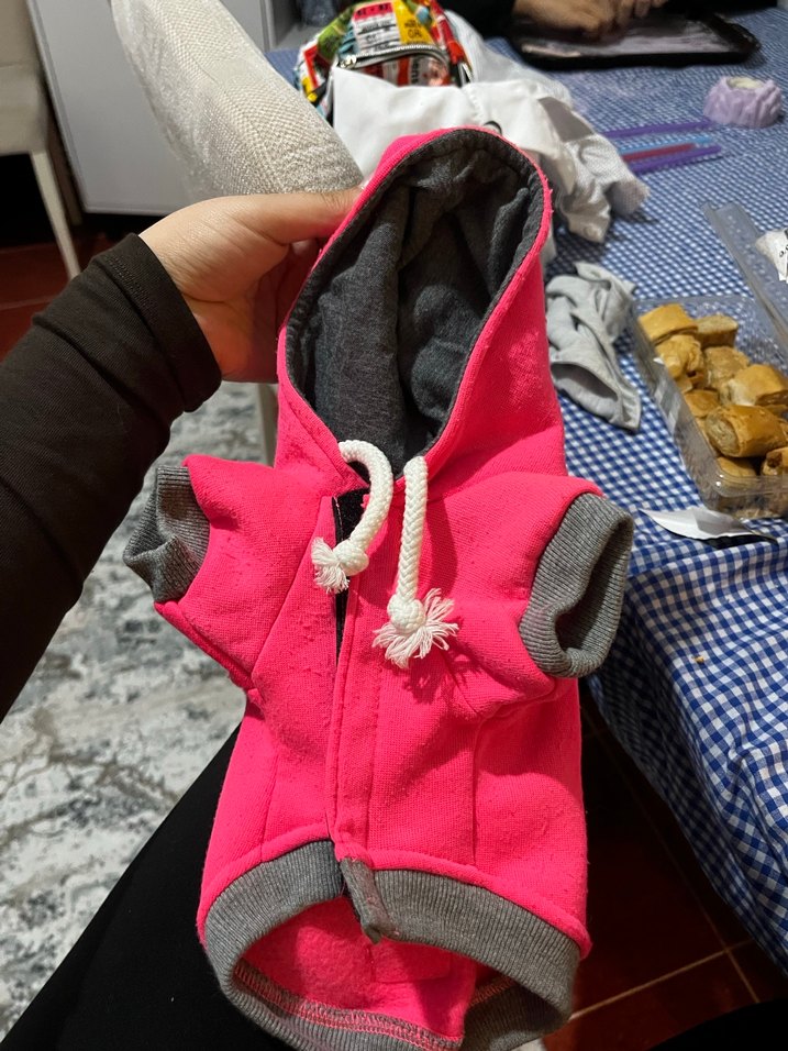 Renkli fermuarlı, kapüşonlu ve ip detaylı pembe köpek kıyafeti. Yumuşak kumaştan, desen içermeyen sokak stili kıyafet.