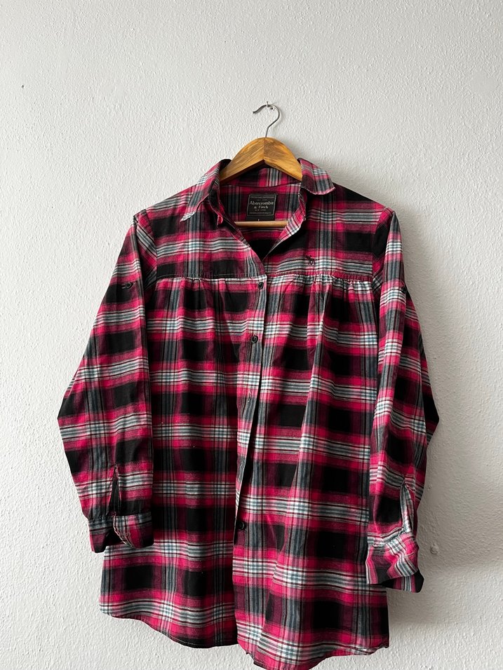 Uzun kollu, düğmeli ve yakalı, bol kesim kadın gömleği. Koyu pembe tie-dye desenli, yumuşak dokulu kumaştan yapılmıştır. Günlük kullanım için uygundur.