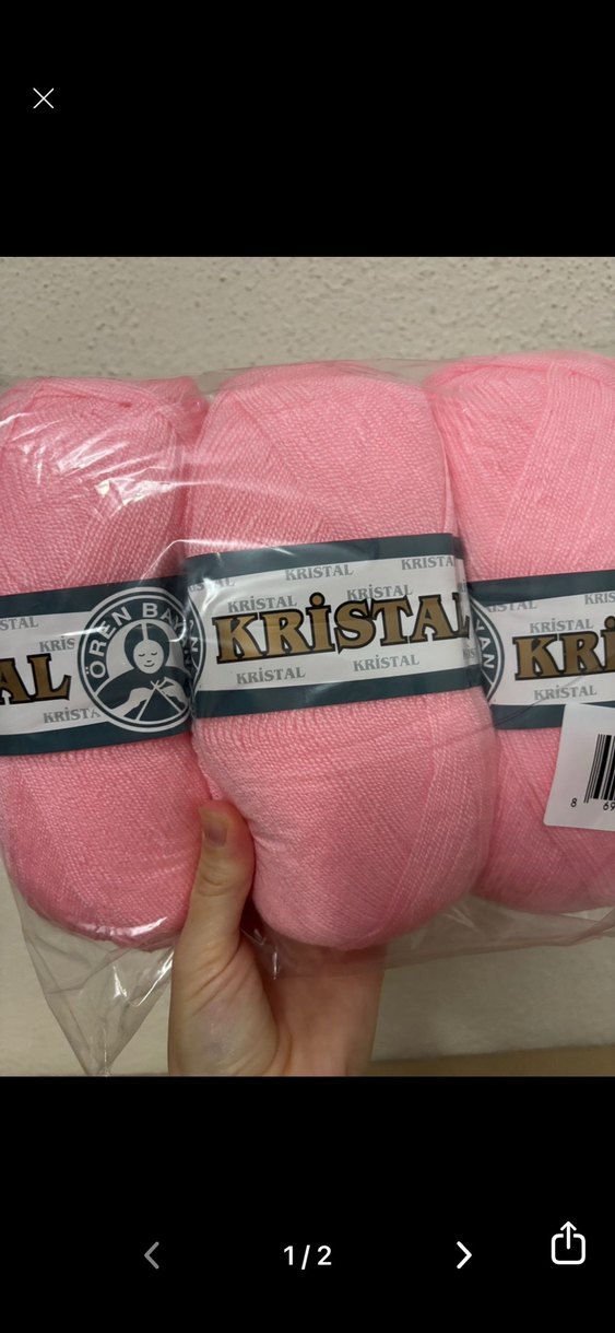 Üç adet yumuşak pembe Kristal iplikten oluşan paket. El işleri için uygundur ve üzerinde 'Kristal' markası bulunur.