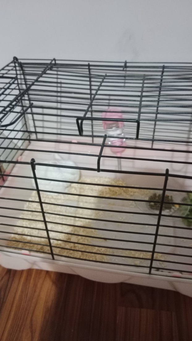Siyah metal tel çerçeveli, pembe küçük evcil hayvan kafesi ve su şişesi içerir.