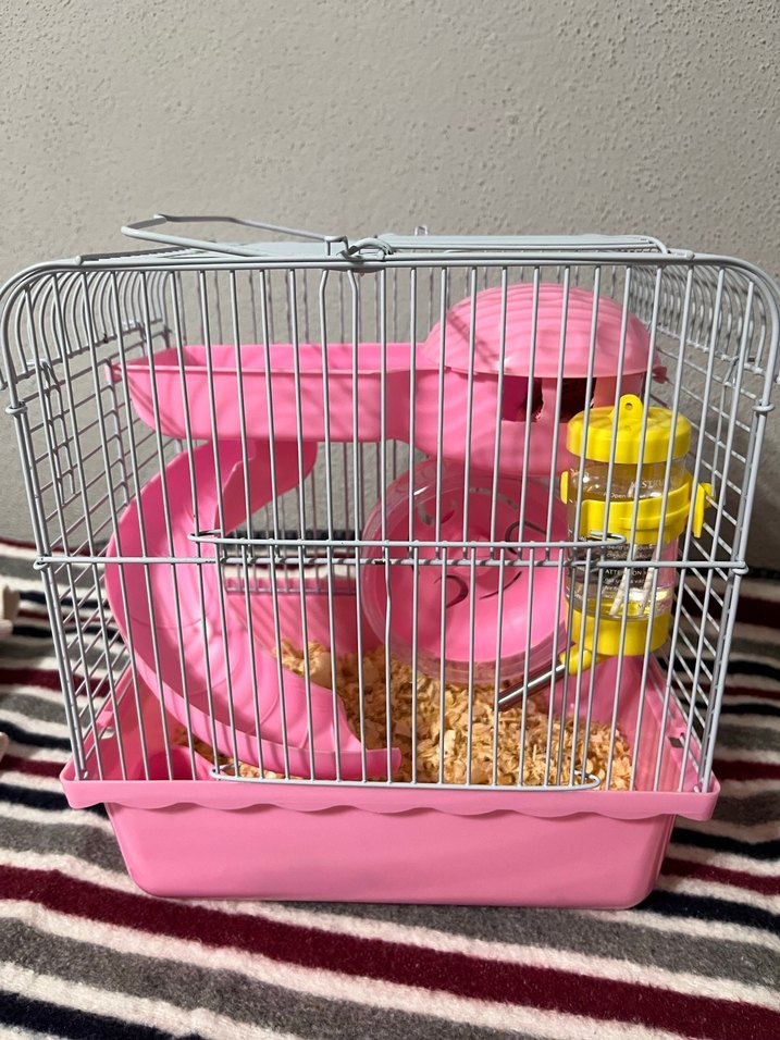Pastel pembe tabanlı küçük evcil hayvan kafesi,. Metal çubuklardan yapılmıştır. Suluk dahil değildir