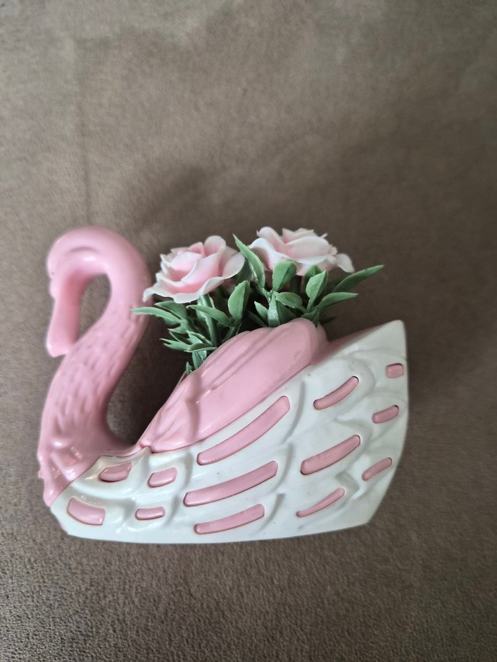 Pastel pembe ve beyaz renklerde, yapay pembe güllerle süslenmiş kuğu şekilli dekoratif vazo. Vintage ürün