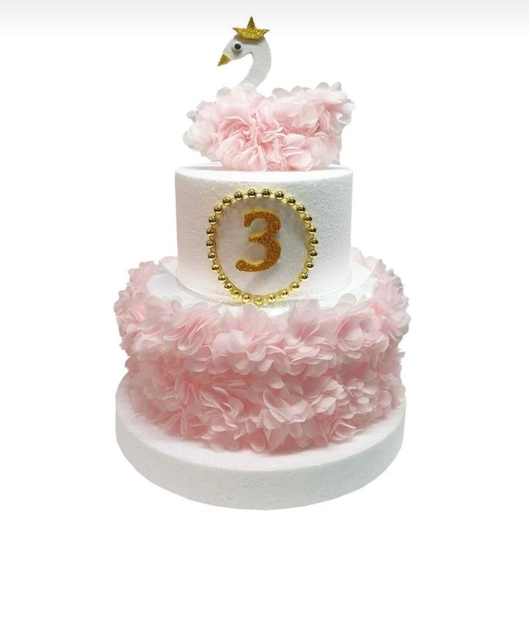 Pastel pembe renkli, kuğu figürlü ve 3 sayılı, yumuşak çiçek detaylı üç katlı pasta süsü. KİRALIK