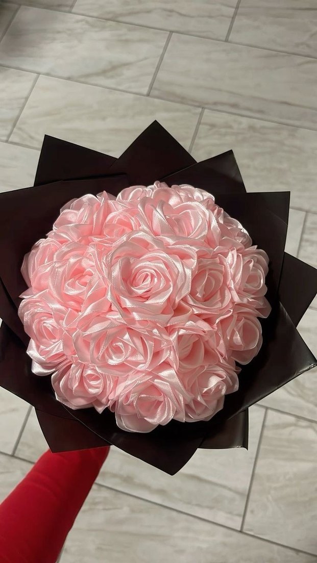 Yumuşak pembe yapay güllerden oluşan, koyu kağıda sarılı buket. Dekorasyon veya hediye için uygundur. istediğiniz renkte ve gül adetinde sipariş olustura bilirsiniz