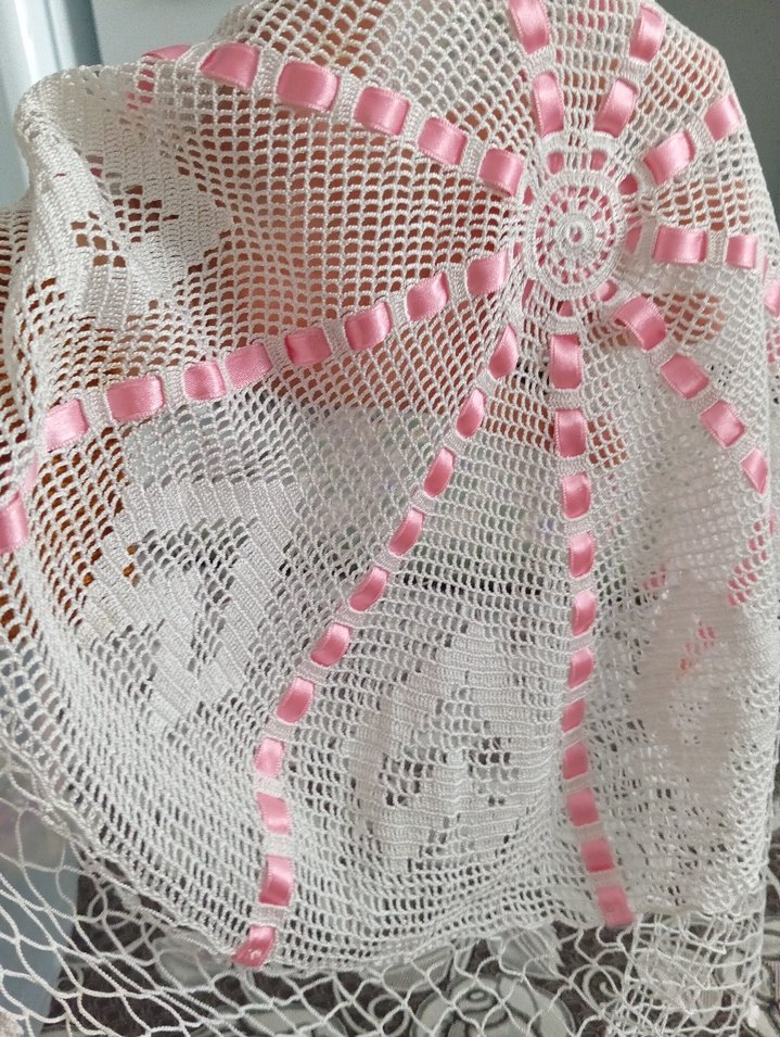 Pembe kurdeleyle süslenmiş ince tığ işi detaylarıyla bohem tarzda dantel örtü.