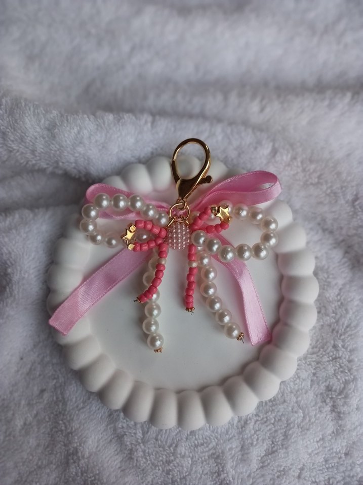 Kadınlar için pastel pembe fiyonk, inci ve boncuk detaylı bohem Paris tarzı çanta charm . sipariş üzerine yapılmaktadır.