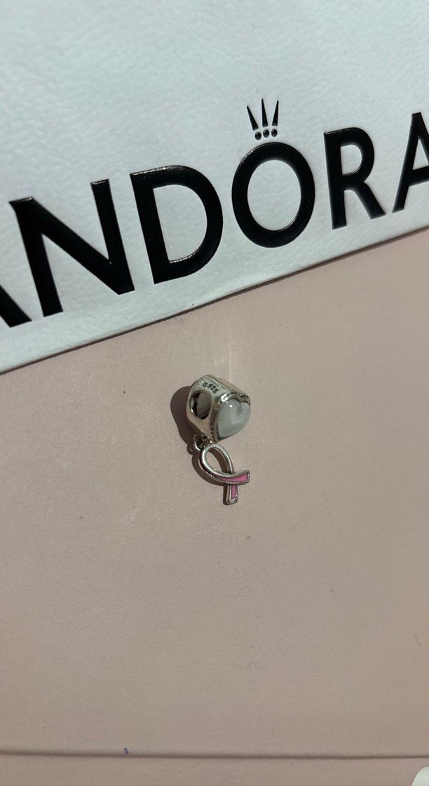 Pandora kadın charm, pembe kurdele deseniyle minimalist ve romantik gece stiline uygun. "NDORA" yazısı bulunur.