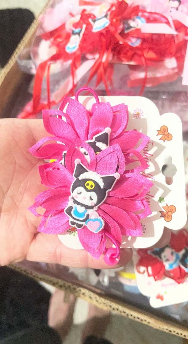 Pembe kurdeleli çiçek şeklinde, pop kültür desenli saç tokası, rock punk tarzına uygun.