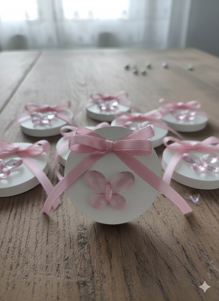 Yuvarlak beyaz hediye magnetleri pastel pembe kurdele ve kelebek süslemeleriyle dekore edilmiştir. Küçük hediyeler için uygundur .