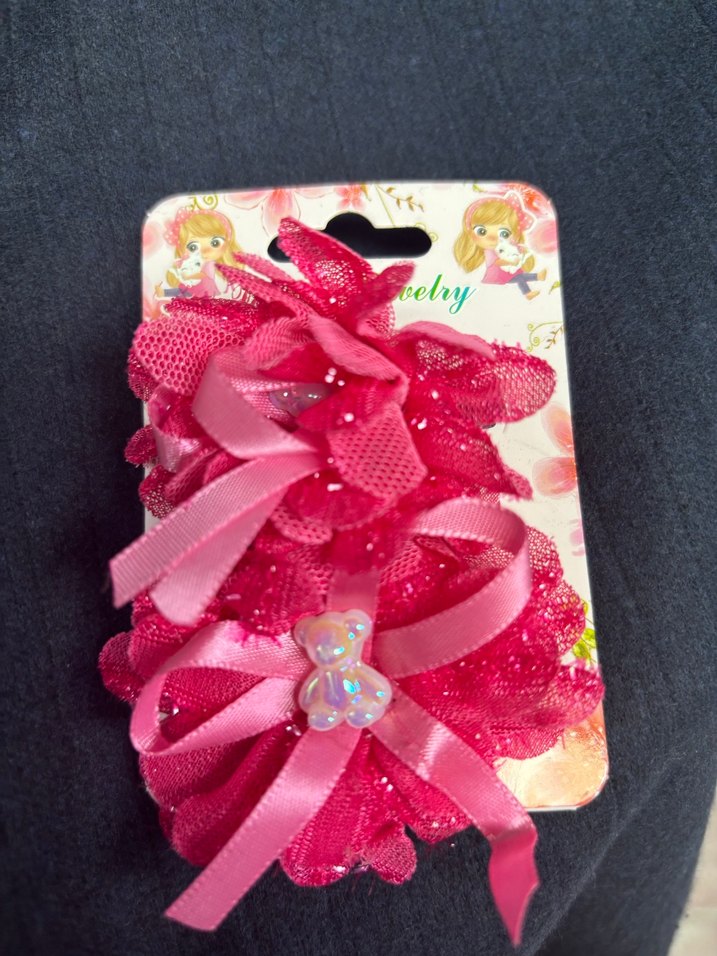 Nakışlı detaylar ve kurdelelerle süslenmiş, bohem tarzda renkli pembe çocuk saç tokaları, küçük ayıcık süsü içerir.