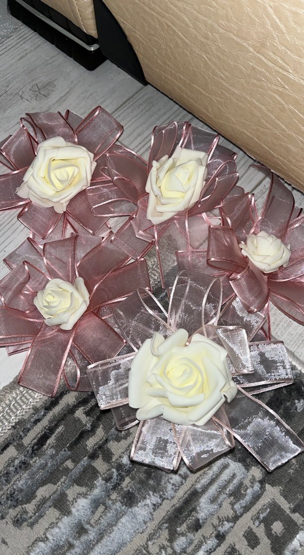 Açık pembe kurdele ve beyaz güllerle süslenmiş, vintage ve klasik tarzda, modaya uygun gelin aksesuarları seti.