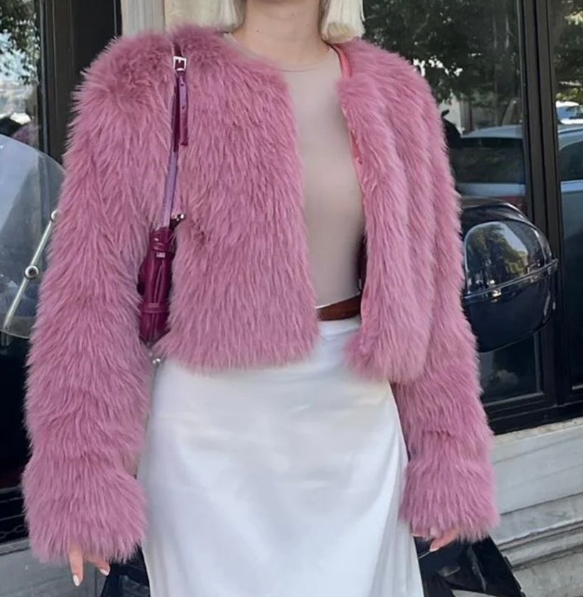 Pembe, uzun kollu, suni kürkten yapılmış, S M L MEVCUT