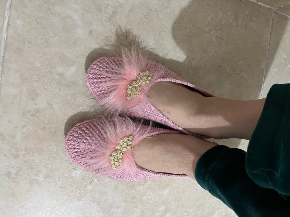El emeğim örgüm.pembe örgü terlik, yumuşak kürk detaylarına sahip sade tasarım. Sıcak ve rahat, pastel tonunda.