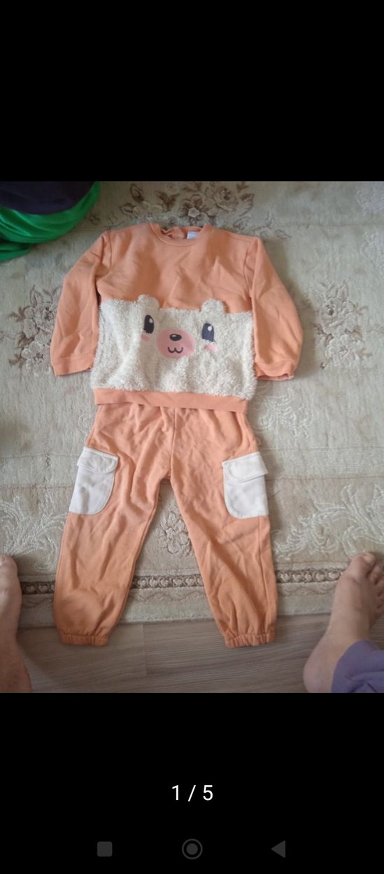 Pastel pembe, uzun kollu, baskılı ayı desenli ve kürk detaylı bebek kız takımı. Cepli pantolon ile tamamlanmıştır.