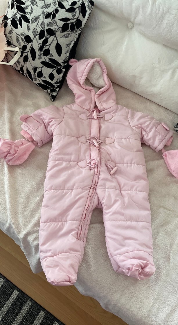 Tertemiz Pastel pembe, kürklü detaylara sahip bebek kız kayak tulumu, sıcak ve rahat kullanım sağlar. ❄️