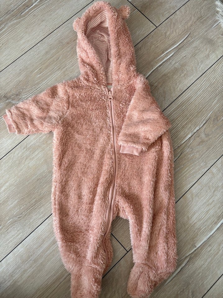 Kürk detaylı, kapüşonlu yumuşak pembe bebek kız tulumu, kolay giydirme için önden fermuarlıdır. 0-3 yazıyor ama ben 6aylık olana kadar giydirdim.