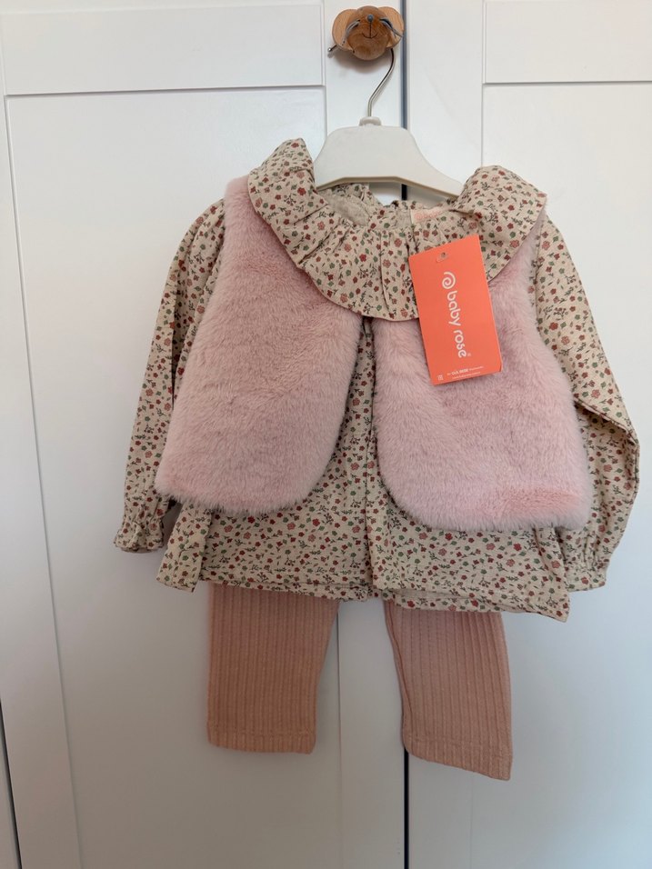 Pastel pembe baskılı uzun kollu bluz, yumuşak kürklü yelek ve uyumlu fitilli tayttan oluşan bebek kız takımı. Rahat ve şık.