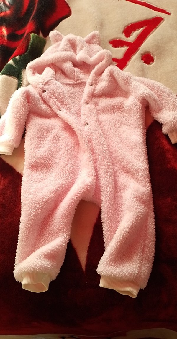 Pastel pembe renkte, kapüşonlu ve kürk detaylı bebek kız tulumu, çıtçıtlı kapama ve ribanalı manşetlere sahip.