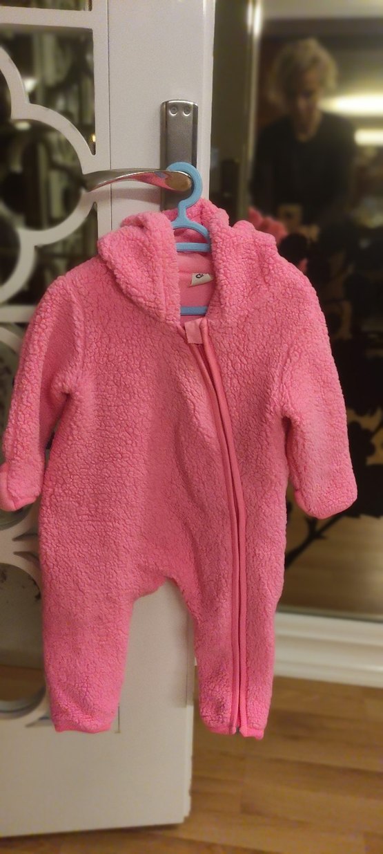 Renkli pembe tonunda, kürklü detaylı ve yakası notched lapel olan bebek kız tulumu, soğuk günler için sıcak tutar. ❄️