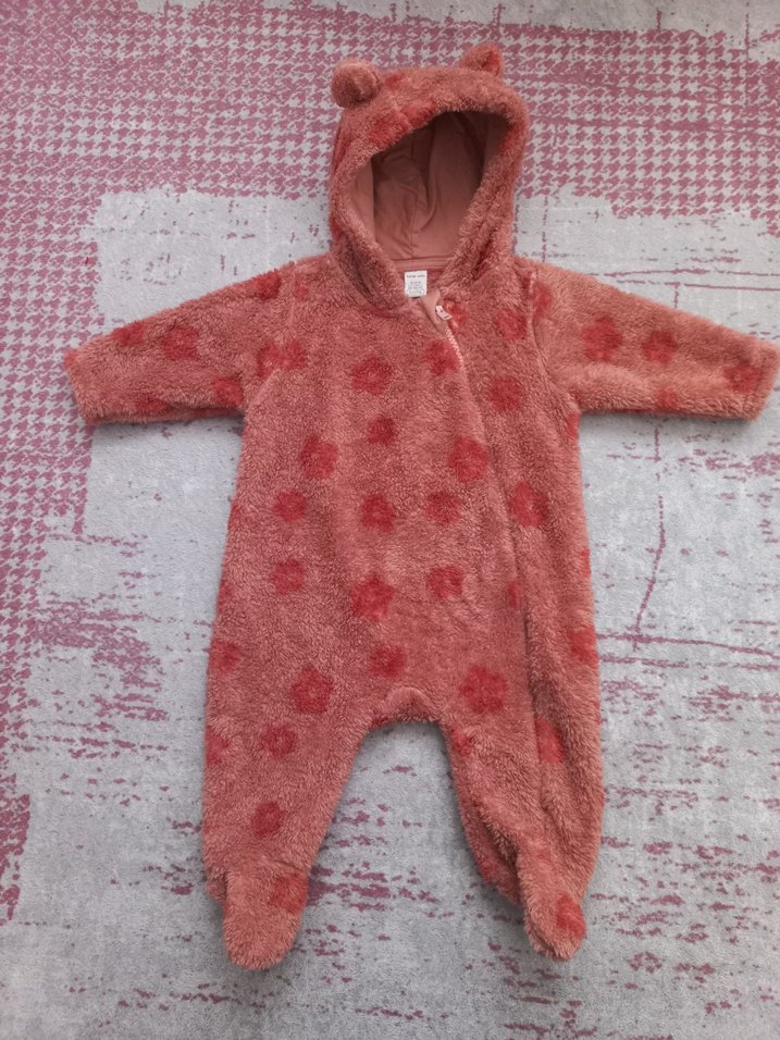 bebek kız tulumu, kulaklı kapüşonlu ve kolay giyilen fermuarlı tasarıma sahiptir. 3-6 ay bebekler için uygundur. Cok iyi durumda