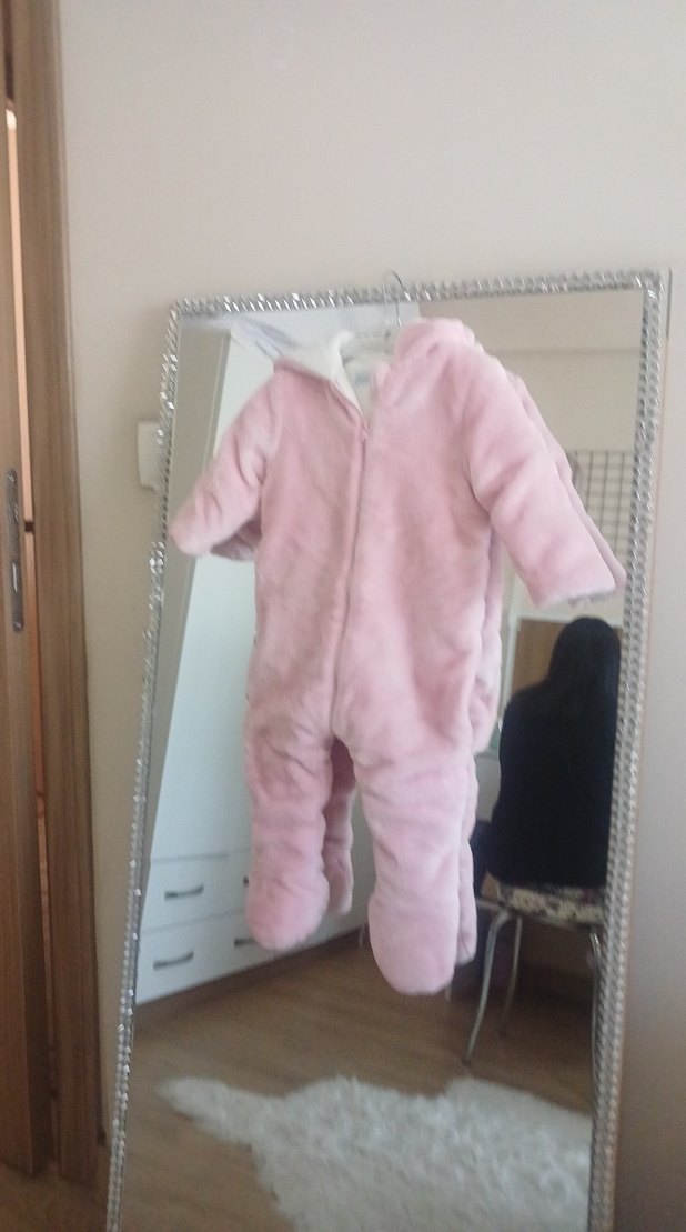 Pastel pembe renkte, kürklü detaylı ve kesimli yakalı bebek kız tulumu. Yumuşak ve sıcak tutan kumaşıyla soğuk havalar için uygundur. ❄️