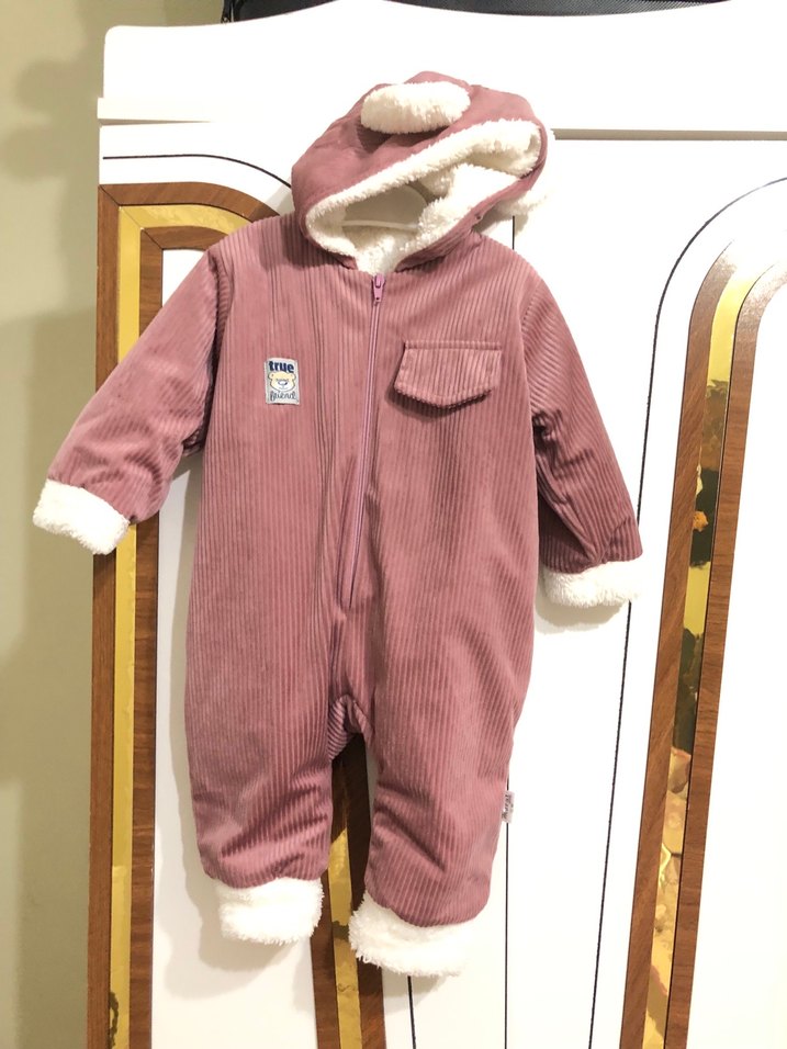 Pastel pembe renkli, yakası kesimli, kapüşon ve manşetlerinde yumuşak kürk detayları bulunan bebek kız tulumu. 2 kere gıyıldı 12 ay ıcı yünlü dışı kadife