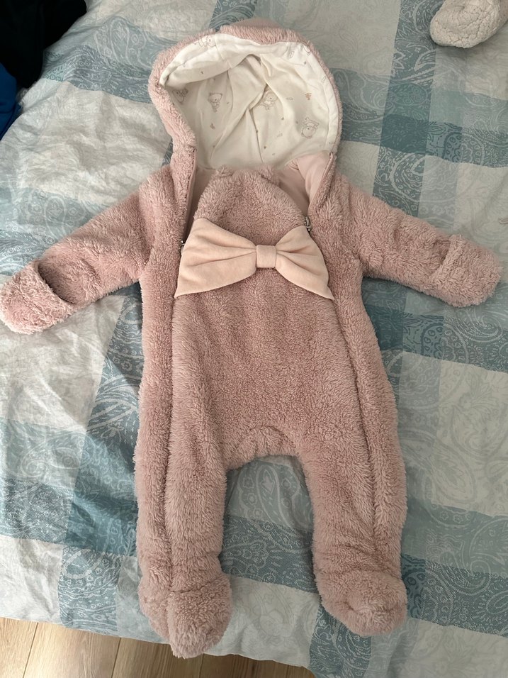 Pastel pembe renkli, yumuşak kürk detaylı bebek kız tulumu. Kapüşonlu ve ayakları kapalıdır, önünde büyük bir fiyonk bulunur. Bebeğim uzun olduğu için 1.2 kez giydi tertemiz alan gönül rahatlığıyla alabilir