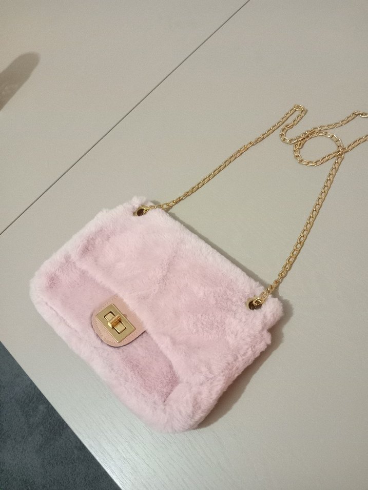 Pembe renkli, yumuşak kürklü kumaştan yapılmış, altın zincir askılı ve kilitli kadın çantası. Rahat sokak stili için uygun.