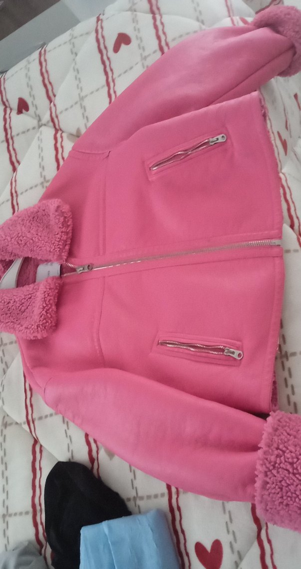Pembe renkli kadın ceketi, fitted kesim, askılı kollu ve yakasında kürk detaylıdır. İki fermuarlı cep ve midi uzunluğa sahiptir. Günlük kullanıma uygundur. sol tarafında mora çalan bir leke vardır kolda ve belde sulu boya işlenmiş gibi fazla göstermiyor ama yakından fark ediliyor.