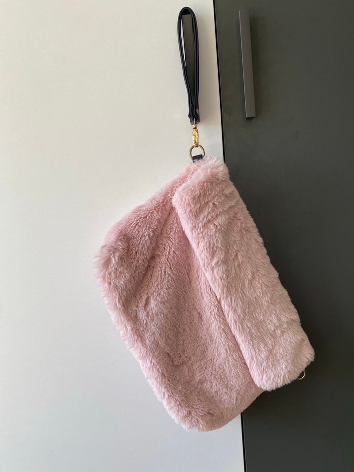 Yumuşak kumaştan, pembe renkli ve kürk detaylı, siyah bilek askılı günlük el çantası.