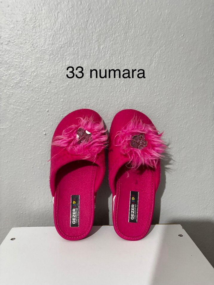 Pembe renkte, kürklü detaylı kadın ev terliği. Lastik malzemeden, düz tabanlı ve 33 numara. Renkli desenli, rahat günlük kullanım için uygundur.