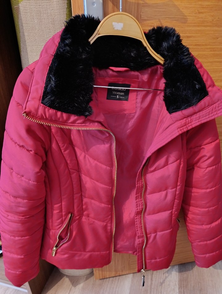 Pembe, kürklü detaylı, yumuşak ve sıcak kumaştan, normal uzunlukta ve dar kesimli kadın kışlık mont. Günlük rahat kullanıma uygun.